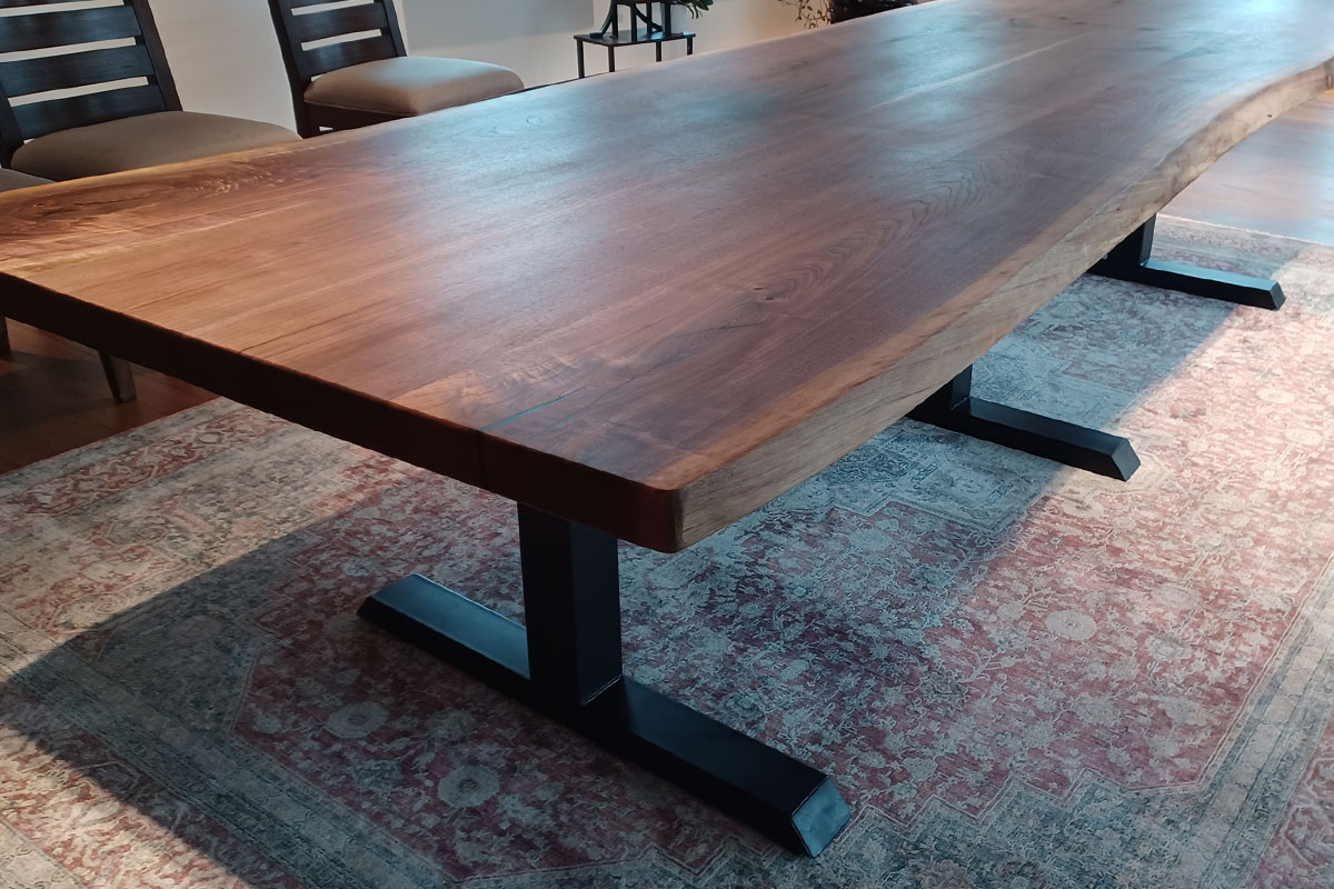 We have a selection of wood dining tables to choose from including solid wood top to bottom, live edge ding tables or a custom design dining tables with our own handcrafted metal accents, fabricated onsite. All the wood we use is locally sourced, and all our wood dining tables are handmade. by Steve Shelley.